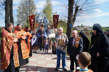 Среди молившихся присутствовал участник Великой Отечественной войны Виктор Семенович Стрюцков, которому недавно исполнилось 96 лет. Ветерана поздравили с праздником, поблагодарили за его ратный подвиг и пропели многолетие. Виктор Семенович сказал несколько слов о той страшной войне, когда долгожданная победа была одержана ценой многих миллионов человеческих жизней, отметив, что не меньше подвига воинского был подвиг женщин, перенесших страдания, голод и тяжкий труд.