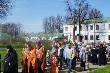 Затем крестным ходом все прошли к памятнику погибшим воинам, расположенному напротив Святых врат обители. В этом месте находится воинское захоронение: в братской могиле лежат защищавшие Москву воины. К памятнику возложили цветы, а также здесь была отслужена лития по всем почившим в годы войны.