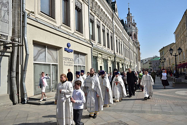 По окончании богослужения состоялся крестный ход по Никольской улице. Торжественная процессия прошествовала от врат обители по Никольской улице с остановками напротив Никольской башни Кремля, у площади Лубянка и на месте разрушенного Никольского собора Николо-Греческого монастыря.