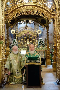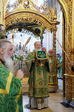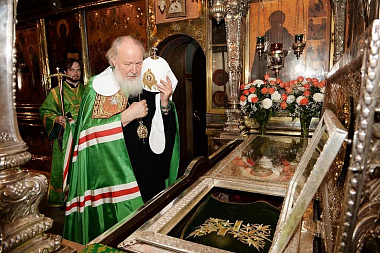 По прибытии в Лавру Святейший Владыка проследовал в Троицкий собор, где поклонился честным мощам преподобного Сергия Радонежского, а также святыням, находящимся в Серапионовой палате.