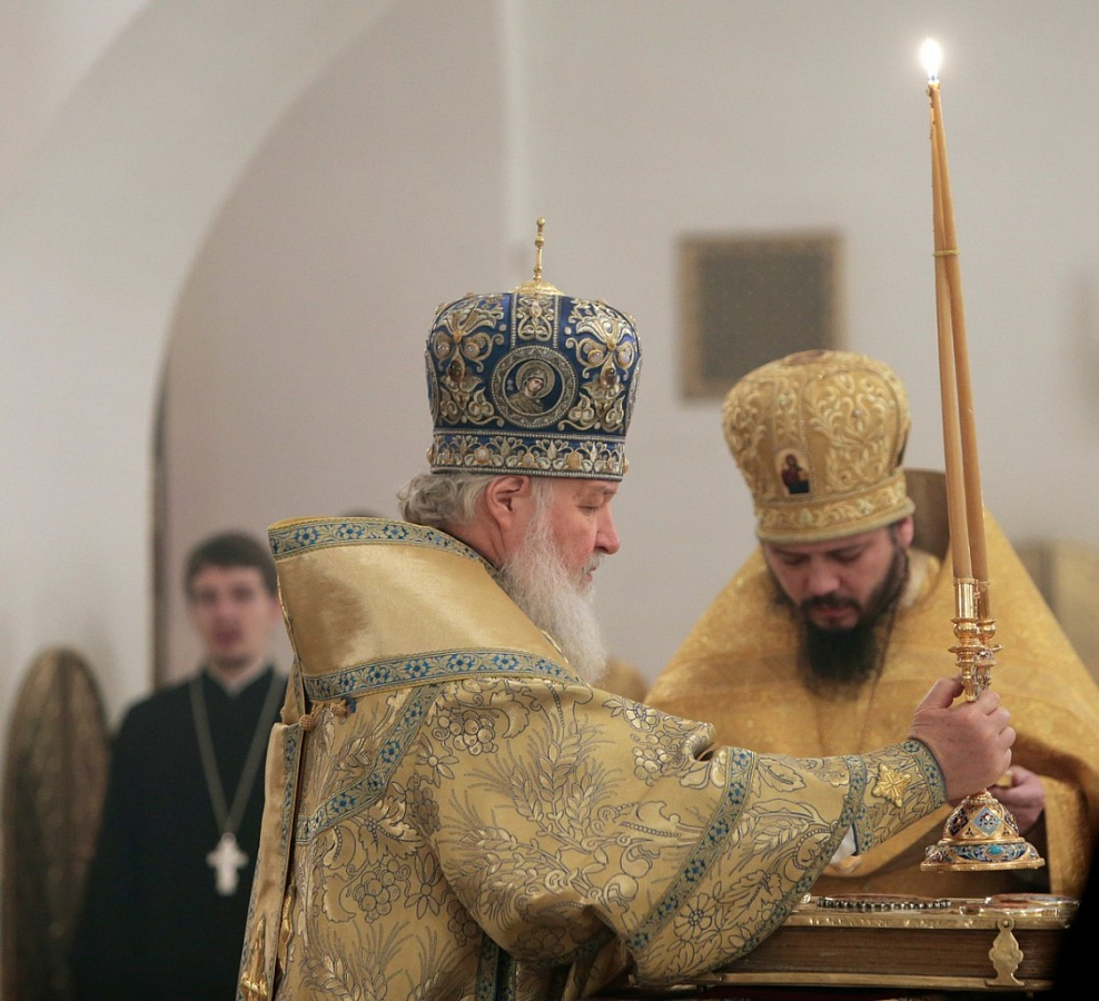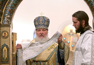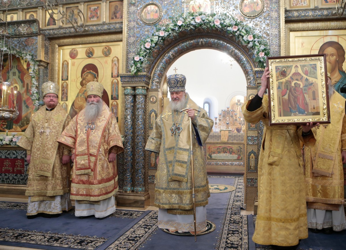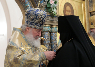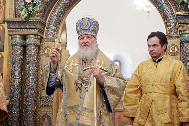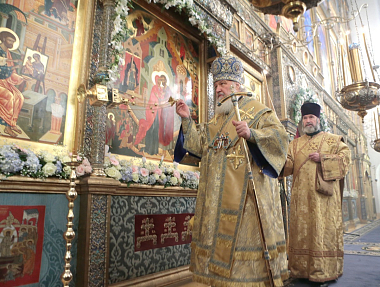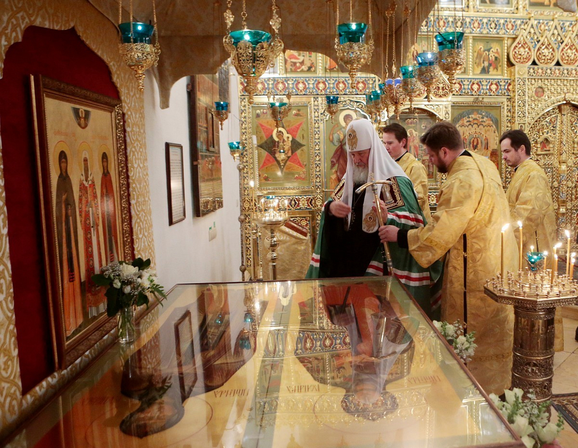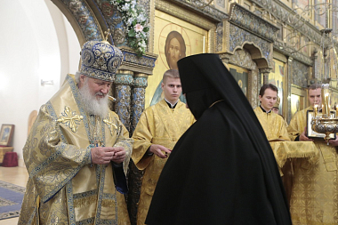 В соборе Рождества Пресвятой Богородицы Предстоятель Русской Православной Церкви поклонился месту погребения основательниц обители преподобных Иулиании и Евпраксии, а затем возглавил Божественную литургию.