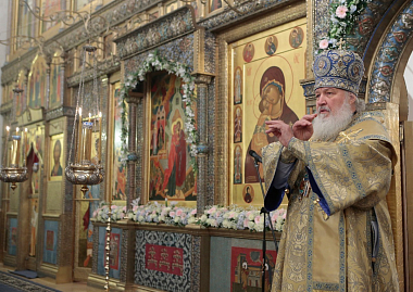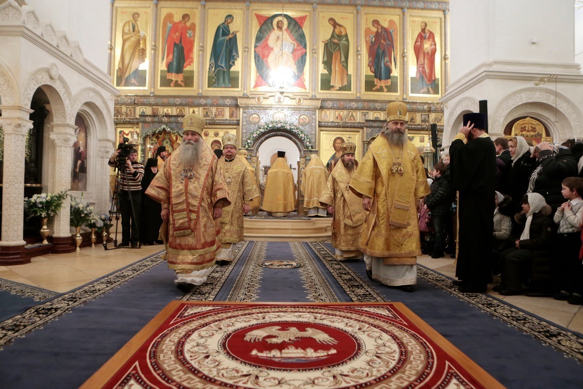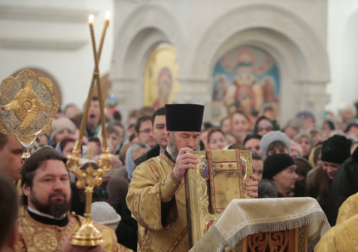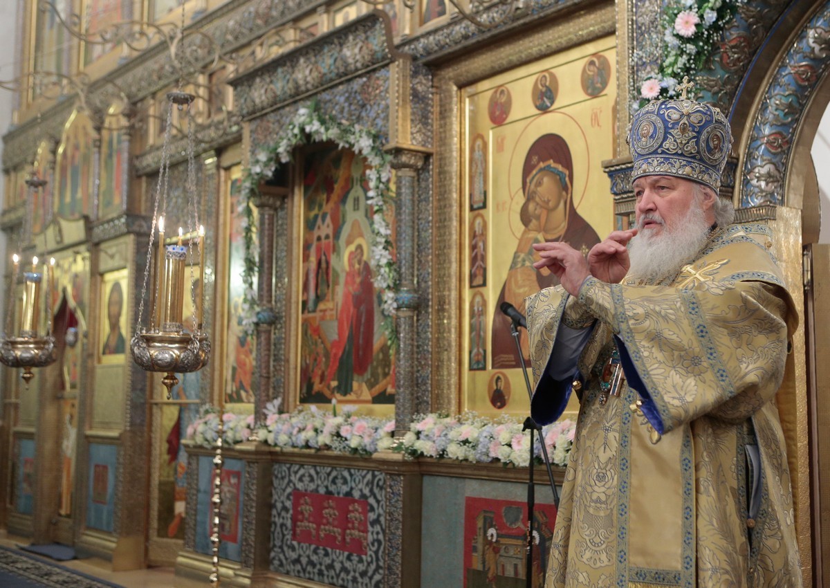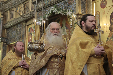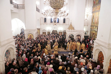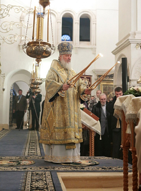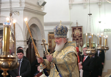В соборе Рождества Пресвятой Богородицы Предстоятель Русской Православной Церкви поклонился месту погребения основательниц обители преподобных Иулиании и Евпраксии, а затем возглавил Божественную литургию.