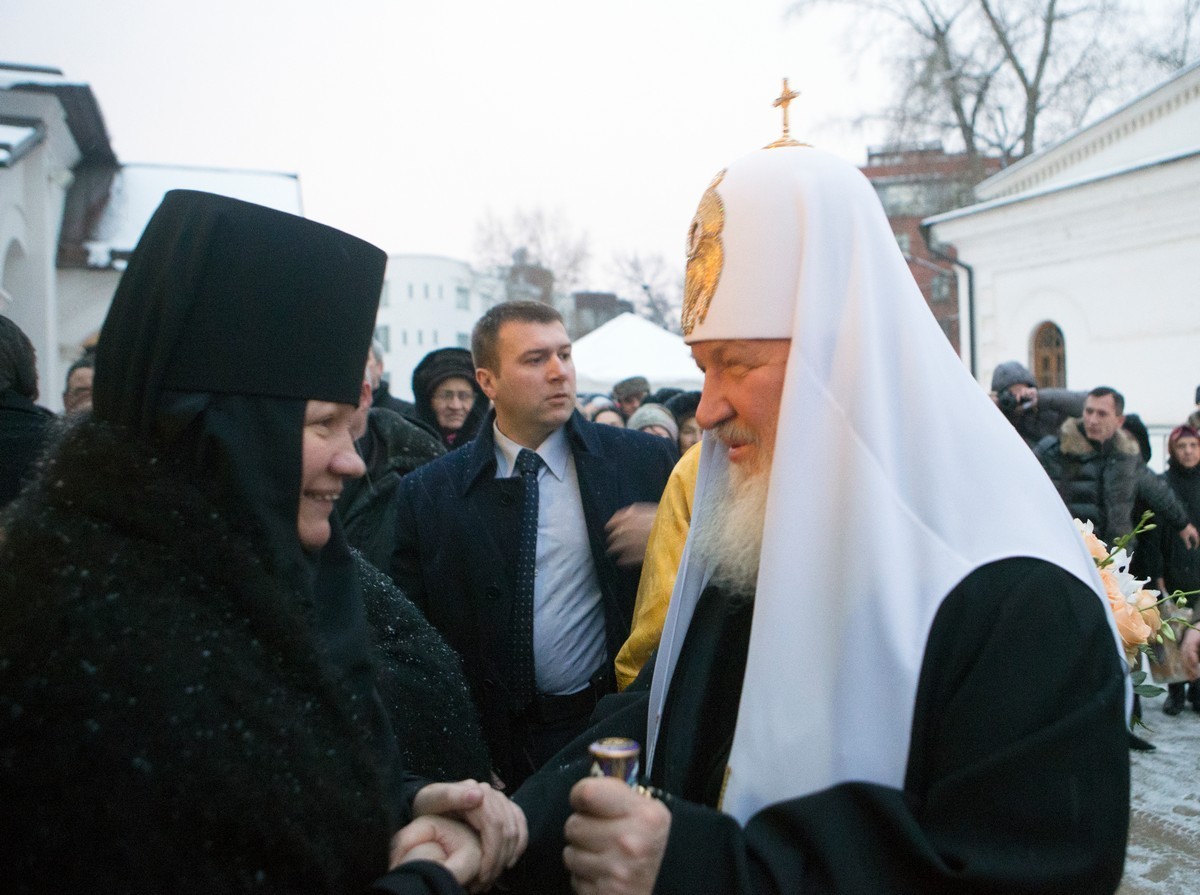 По окончании богослужения от лица насельниц обители Святейшего Патриарха Кирилла приветствовала настоятельница Зачатьевского монастыря игумения Иулиания (Каледа). В дар Его Святейшеству матушка Иулиания преподнесла образ святых праведных Иоакима и Анны.