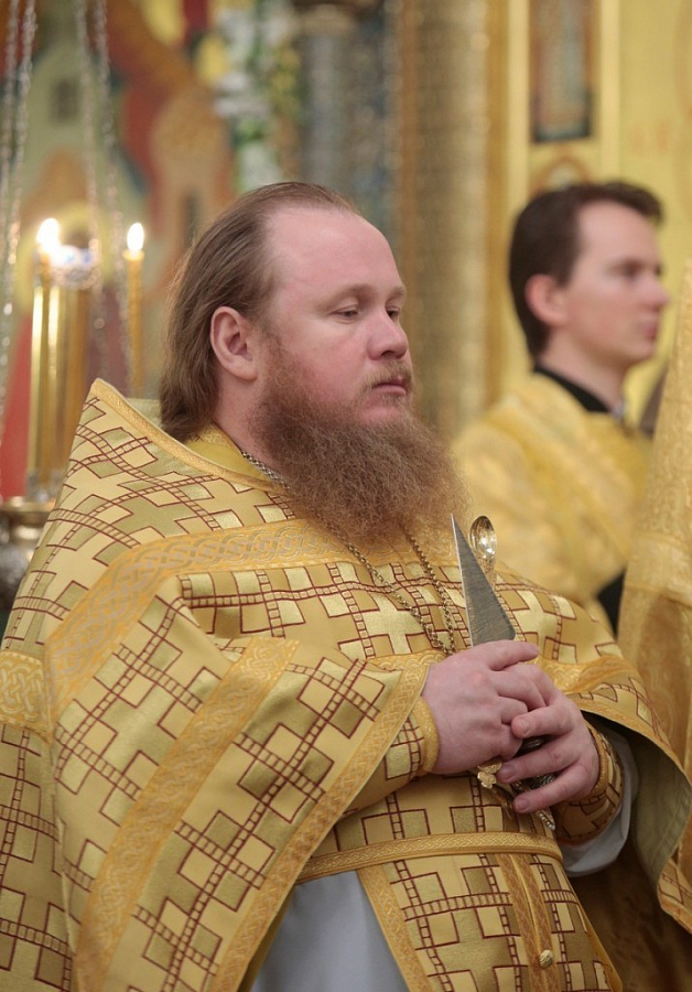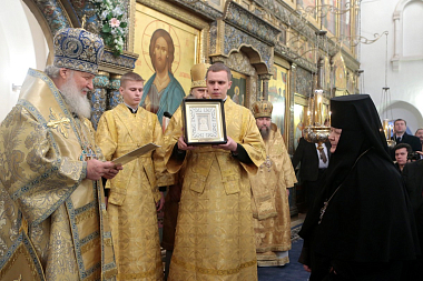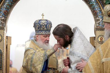 За Литургией Святейший Патриарх Кирилл рукоположил в сан иерея диакона Дионисия Васильева, клирика Заиконоспасского монастыря.