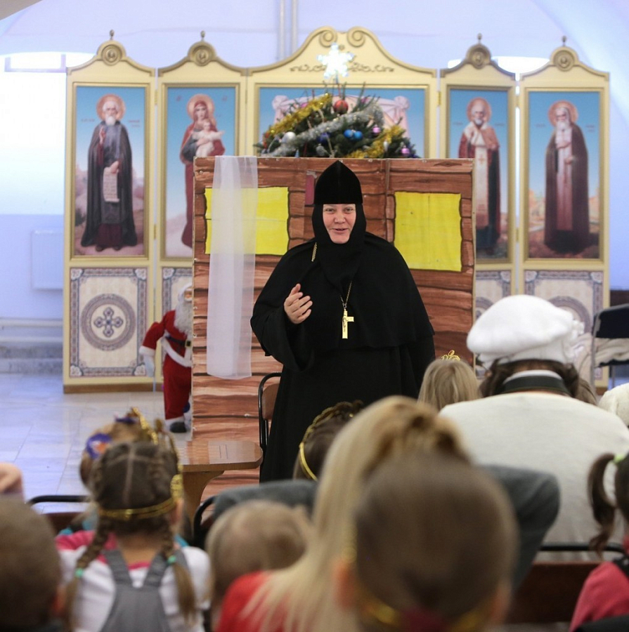 Торжество началось с Божественной литургии в Вознесенском соборе. На праздник были приглашены дети с ограниченными возможностями, проходящие лечение и реабилитацию в Российском реабилитационном центре «Детство», куда они приехали из разных городов России: Махачкалы, Краснодара, Нижнего Новгорода, Пензы, Курска, Саратова, Калуги, Краснодара, Омска и др. Перед началом представления настоятельница монастыря игумения Екатерина поздравила всех детей и гостей с праздником Рождества Христова и Новолетием. Перед входом в зал детей ожидал маленький сюрприз: короны как украшение к балу для принцев и принцесс. Детский праздник украсили и дед Мороз со Снегурочкой. Почетные гости монастыря - группа паломников из города Клинцы Брянской области - спели колядки и рассказали Рождественские стихи. Учащиеся студии «Глаголъ Добро» Православного творческо-просветительского центра «Купель» подготовили весёлую Рождественскую сказку, яркие костюмы и декорации. А после вместе с приглашенными детьми они водили хороводы вокруг украшенной светящимися гирляндами и шарами ёлки, играли с ними в «ручеёк», танцевали под музыку и веселились.