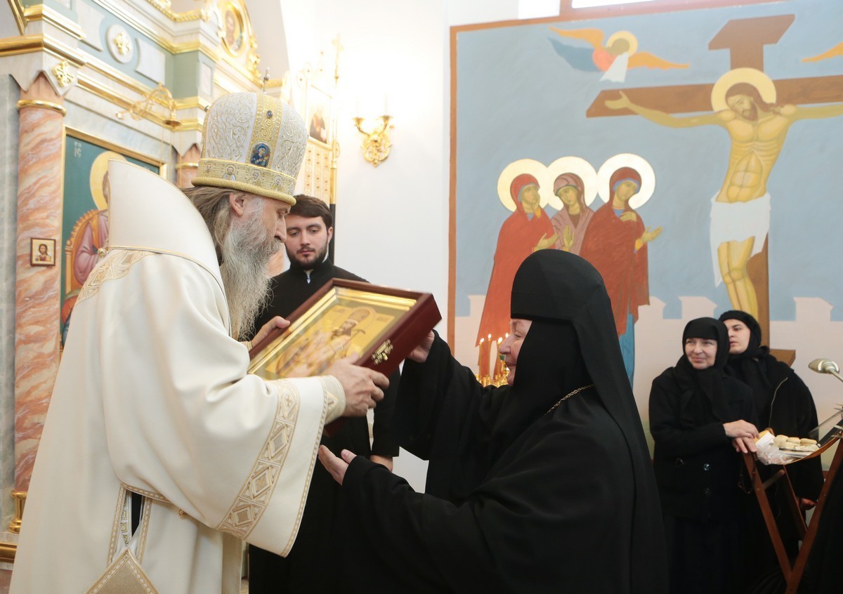 Игумения Мария поблагодарила владыку Феогноста и вручила ему в дар икону свт. Димитрия Ростовского.