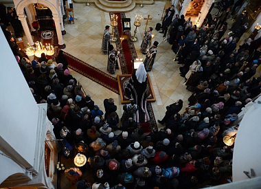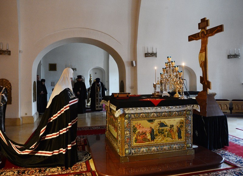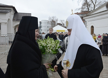 По окончании богослужения Предстоятеля Русской Православной Церкви приветствовала игумения Иулиания. Настоятельница обители преподнесла Его Святейшеству образ Спаса Нерукотворного.