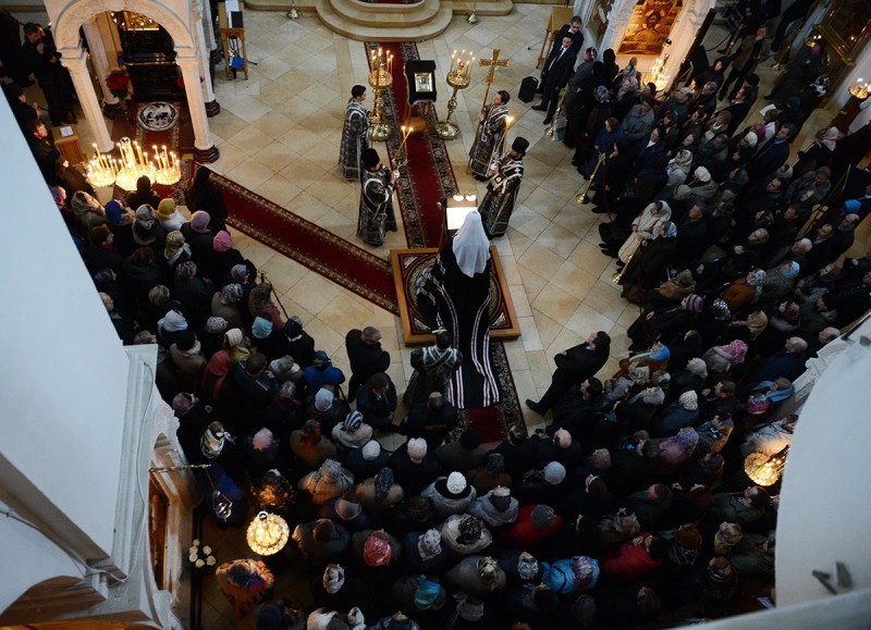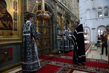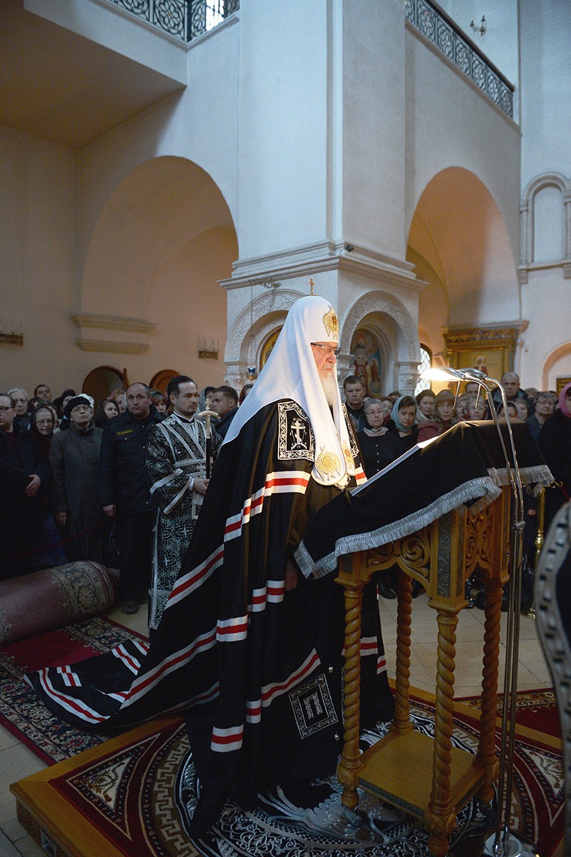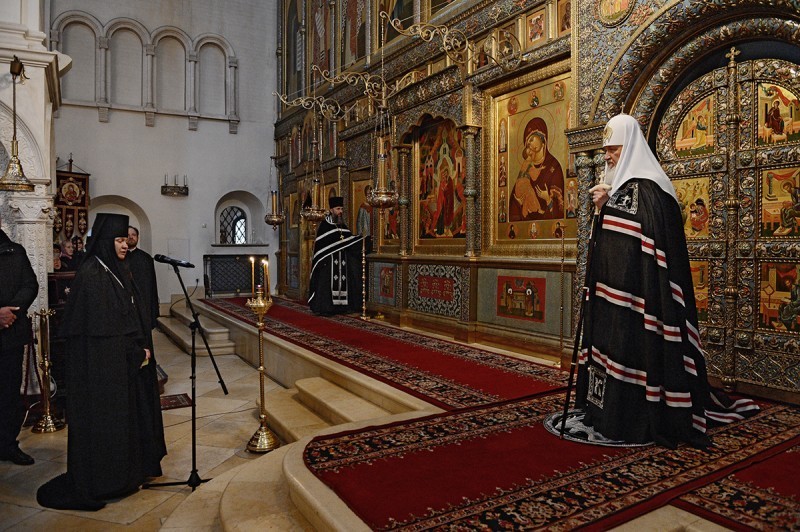 В соборе Рождества Пресвятой Богородицы Предстоятель Русской Церкви принял участие в вечернем богослужении в канун Великого вторника. На великом повечерии Святейший Патриарх Кирилл читал канон Триоди, а на утрене — Евангелие.