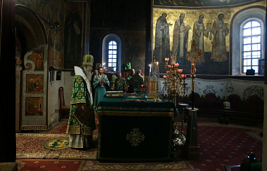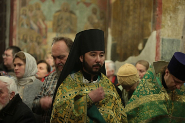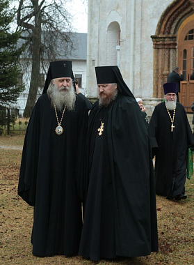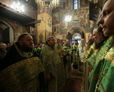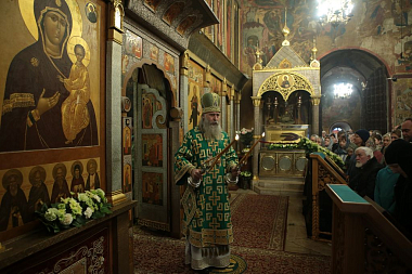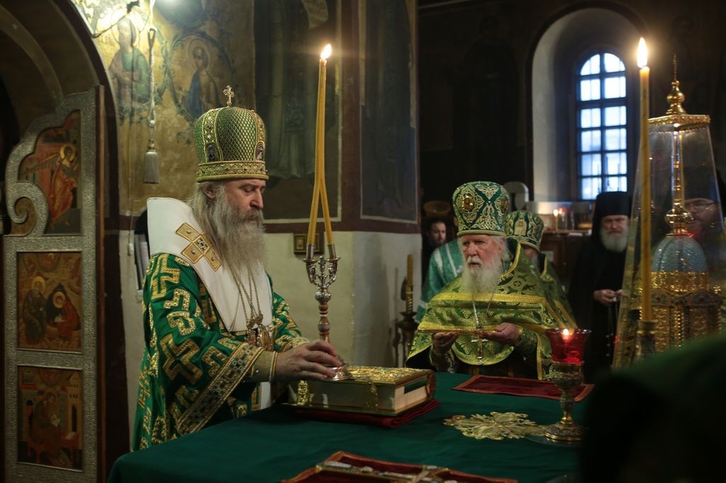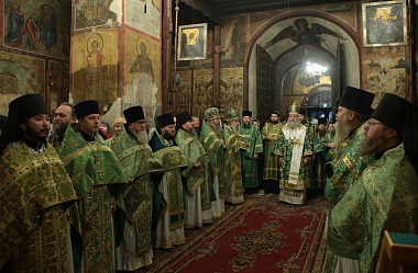 Его Высокопреосвященству в монастырском соборе Рождества Божией Матери сослужили: наместник Саввино-Сторожевского монастыря архимандрит Павел (Кривоногов); настоятель Московского Троицкого подворья Свято-Троицкой Сергиевой лавры архимандрит Стефан (Тараканов), заместитель председателя Синодального отдела по монастырям и монашеству; настоятель Московского подворья Введенского ставропигиального мужского монастыря Оптина пустынь архимандрит Мелхиседек (Артюхин), пресс-секретарь Синодального отдела по монастырям и монашеству; генеральный директор Патриаршего издательско-полиграфического Центра архимандрит Алипий (Кастальский-Бороздин); насельник Свято-Троицкой Сергиевой лавры архимандрит Диодор (Дидковский); благочинный Звенигородского округа Московской областной епархии протоиерей Николай Курдов; настоятель подворья «Куликово поле» Свято-Троицкой Сергиевой лавры игумен Христофор (Бойчук); братия монастыря, подворий и гости обители в священном сане.