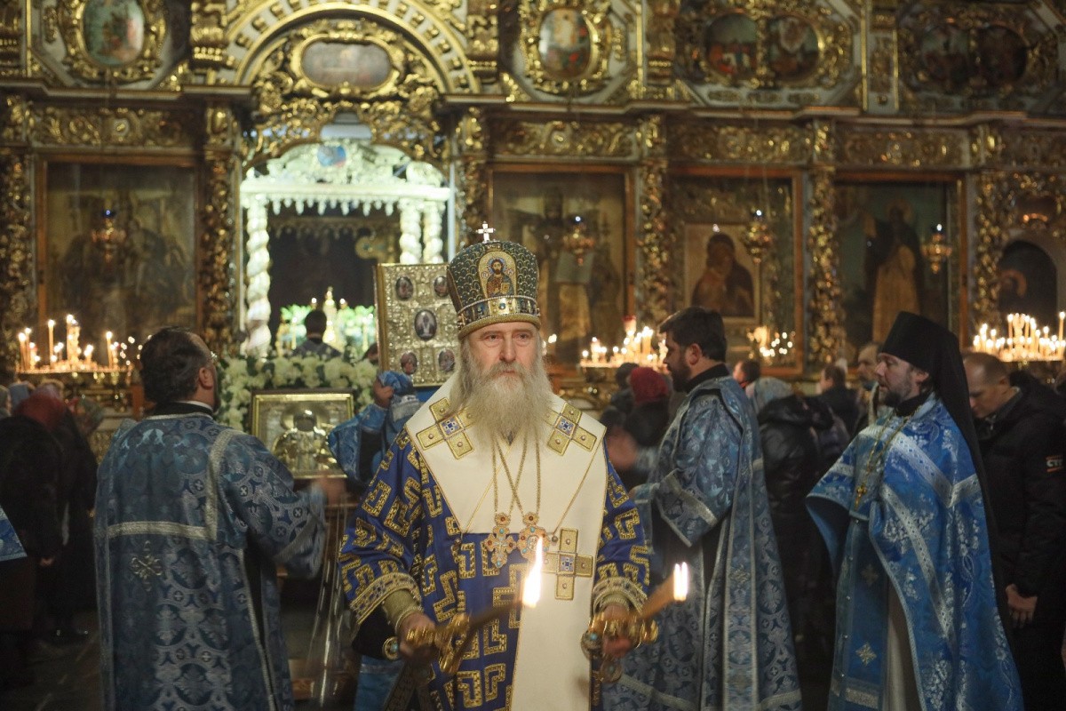 В завершение богослужения Преосвященнейший владыка с братией обители совершили молебен перед мощами святителя Тихона.