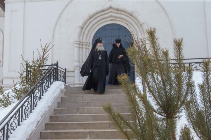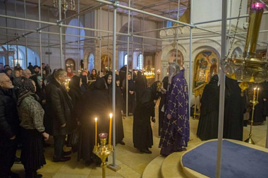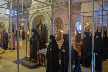 В монастырском соборе Рождества Пресвятой Богородицы Его Высокопреосвященству сослужили заместитель председателя Синодального отдела по монастырям и монашеству архимандрит Стефан (Тараканов) и духовенство обители.