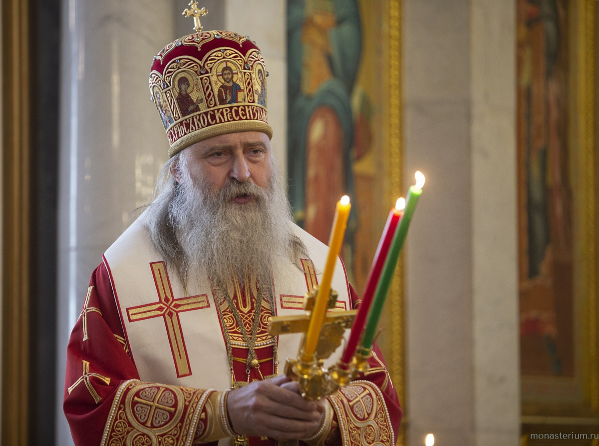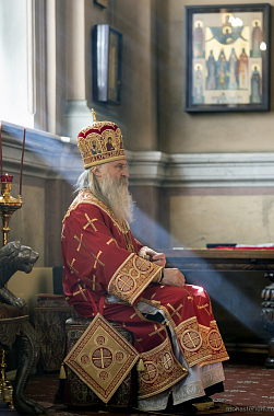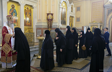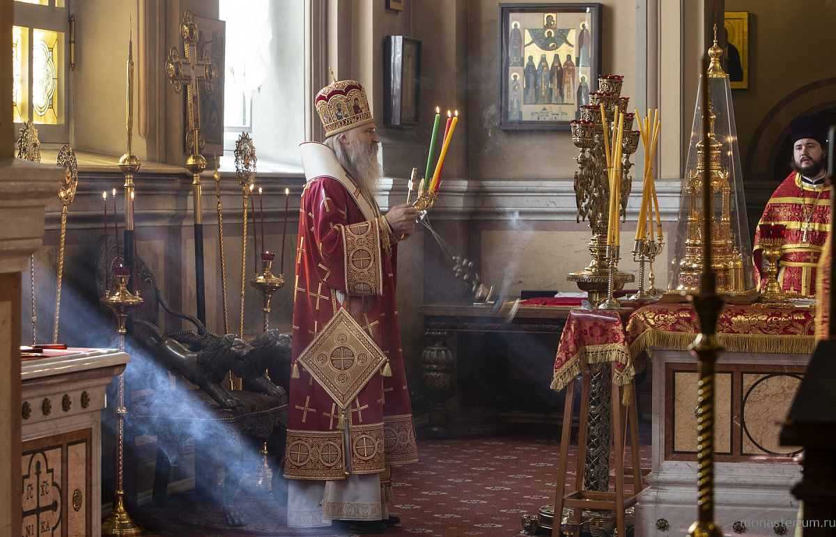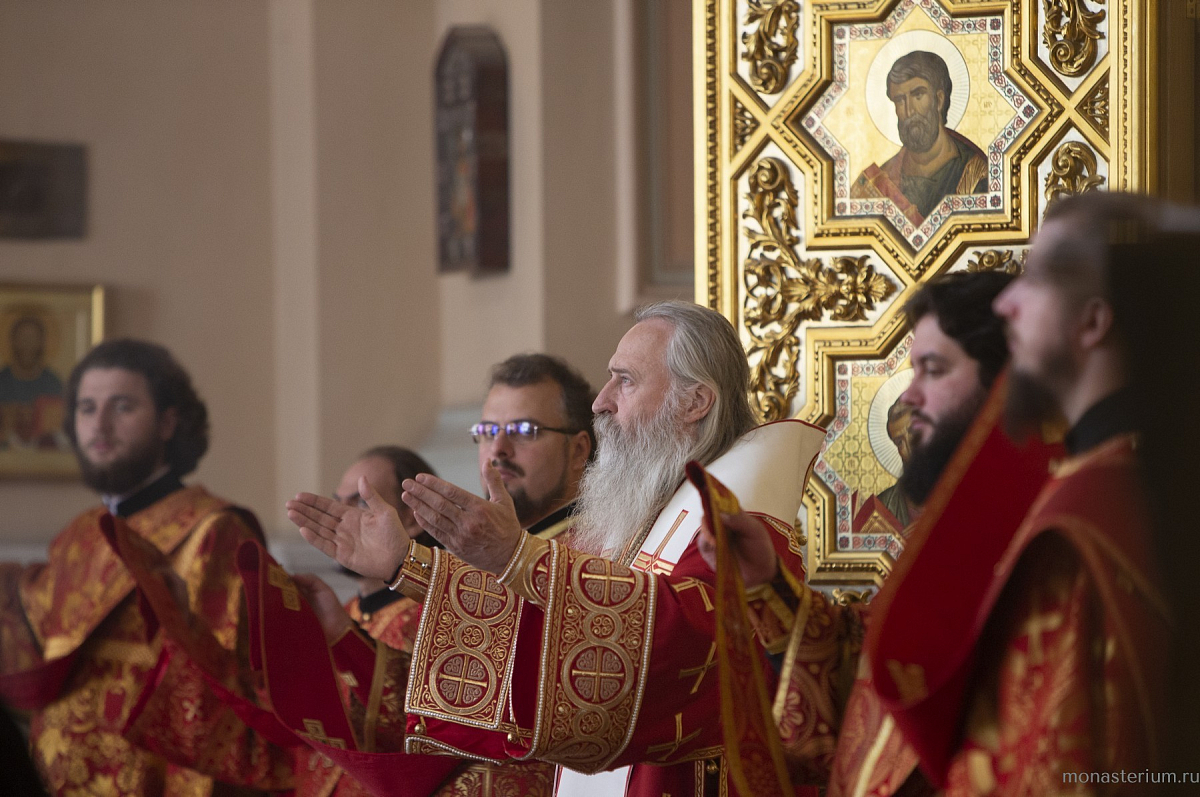 В монастырском соборе в честь Усекновения главы св. Иоанна Предтечи Его Высокопреосвященству сослужили клирики обители.