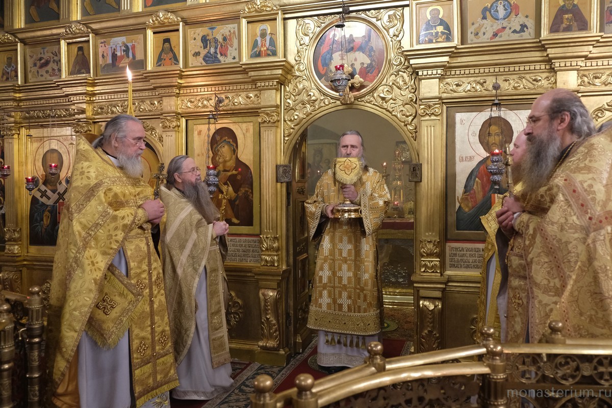 Его Высокопреосвященству сослужили: наместник Данилова ставропигиального мужского монастыря архимандрит Алексий (Поликарпов); пресс-секретарь Синодального отдела по монастырям и монашеству, настоятель храма Святых апостолов Петра и Павла в Ясеневе московского подворья Введенского ставропигиального мужского монастыря Оптина пустынь архимандрит Мелхиседек (Артюхин); наместник Николо-Угрешского монастыря игумен Варфоломей (Петров); наместник Высоко-Петровского ставропигиального мужского монастыря игумен Петр (Еремеев); братия Угрешской обители в священном сане.