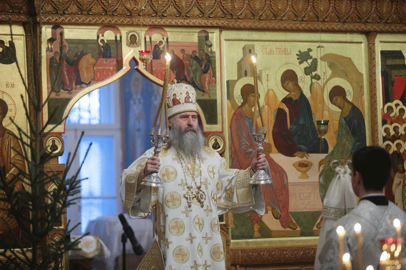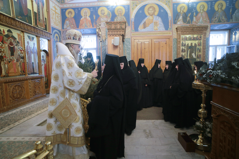 По окончании богослужения Владыка Феогност поздравил настоятельницу обители игумению Олимпиаду (Баранову) с сестрами и воспитанницами пансиона и всех присутствующих с праздником Рождества Христова и обратился к молящимся с архипастырским словом: