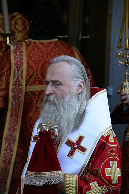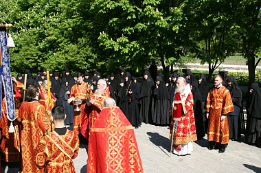 Затем Высокопреосвященнейший владыка поздравил настоятельницу монастыря игумению Сергию (Щербакову) с сестрами с днем возрождения обители и обратился к собравшимся с архипастырским словом: