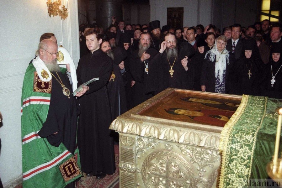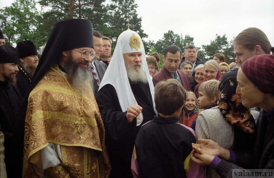 «Визит приснопамятного Патриарха состоялся в августе 1998 года. Не верится, что этим кадрам 20 лет. Видны разруха, порушенные стены – целая эпоха прошла. Это сейчас Святейшего Патриарха на Валааме встречает сотня монахов, а на этих кадрах мы видим десяток насельников, из которых половина – трудники. А самым подобающим транспортом была обыкновенная конная бричка – другого достойного транспорта для Первостоятеля на монашеском острове просто не нашлось.