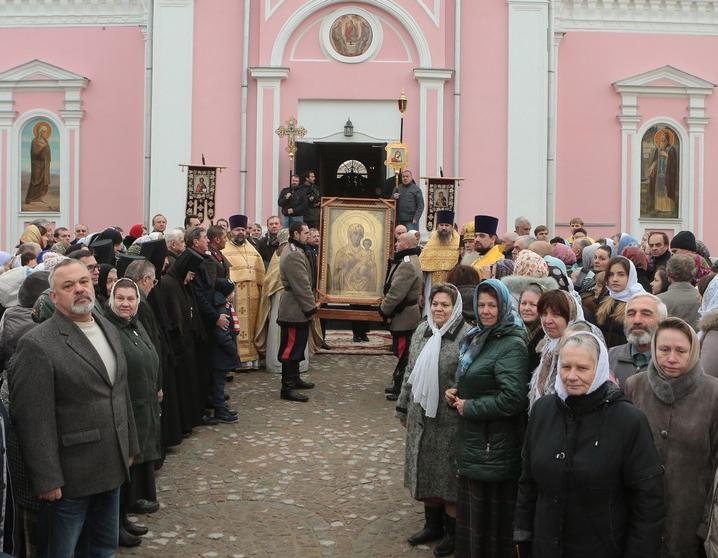 На подъезде к монастырю икону встречали духовенство Москвы и Московской области и многочисленные прихожане. Чудотворный образ, поднятый на специально приготовленные носилки, крестным ходом внесли в Троицкий храм обители.