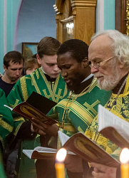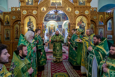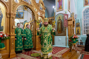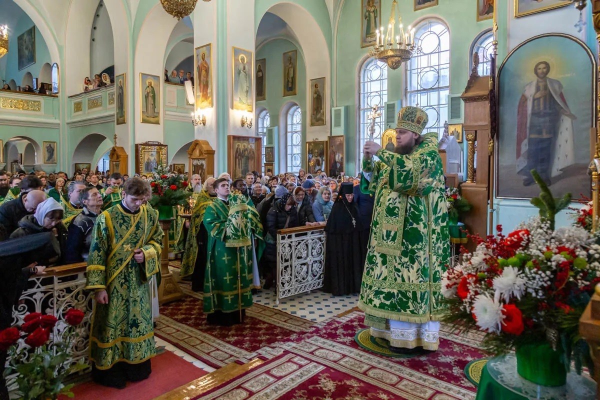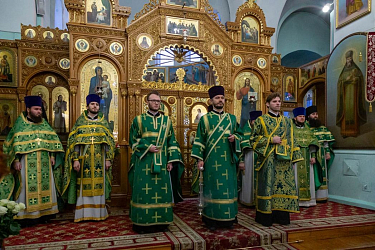 За Литургией Его Преосвященству сослужили клирики монастыря, Духовной академии и других храмов.