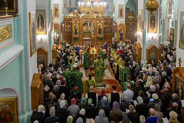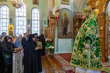 В храме молились настоятельница монастыря игумения Людмила (Волошина) с сестрами, настоятельница Иоанно-Предтеченского женского монастыря г. Москвы игумения Елисавета (Никишкина), гости, прихожане и паломники обители. За Литургией также молились представители администрации города: начальник Отдела по связям с религиозными объединениями В.Г. Иванов, глава Петроградского района В.В. Омельницкий, заместитель главы Петроградского района А.А. Цибиногин.