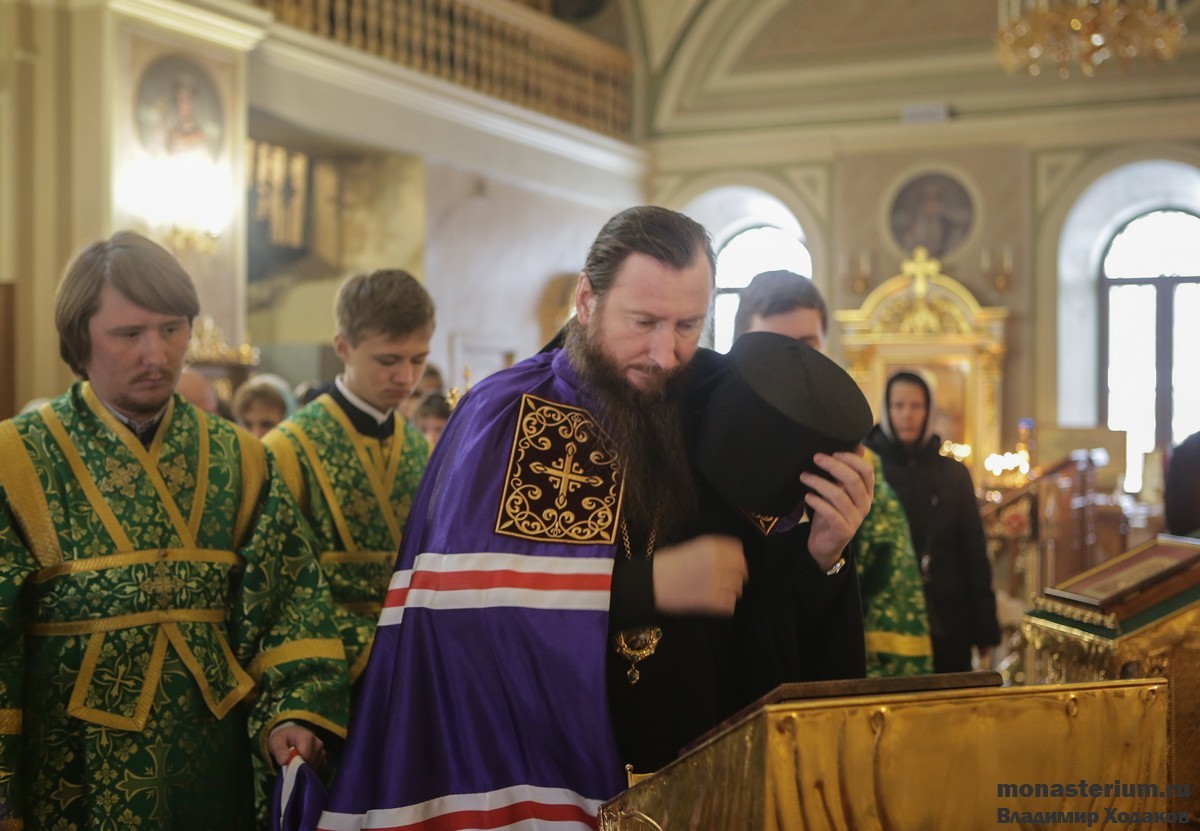 Его Преосвященству сослужили: епископ Ванинский и Переяславский Савватий; клирик монастыря митрофорный протоиерей Николай Сухов; председатель Комиссии по образованию и катехизации викариатства Новых территорий г. Москвы протоиерей Сергий Махонин, настоятель Смоленской часовни в дер. Елизарово (приписной к Свято-Духовскому храму пос. Первомайского); благочинный Одигитриевского округа иерей Петр Панов; клирик храма Казанской иконы Божией Матери в дер. Пучково иерей Олег Гаджиев.