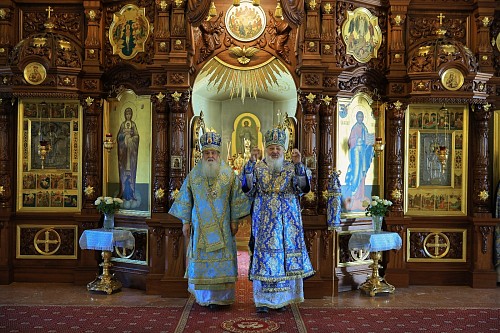 Епископ Роман зачитал поздравление Святейшего Патриарха Московского и всея Руси Кирилла епископу Тихону с 25-летием архиерейской хиротонии. Владыка Роман преподнес от себя владыке Тихону панагию.