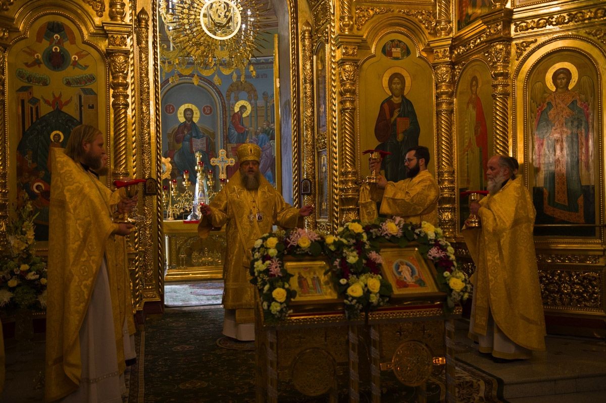 Его Высокопреосвященству сослужили руководитель Аппарата Синодального отдела религиозного образования и катехизации протоиерей Александр Прытков, а также братия храма.