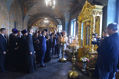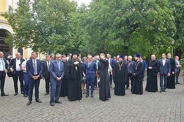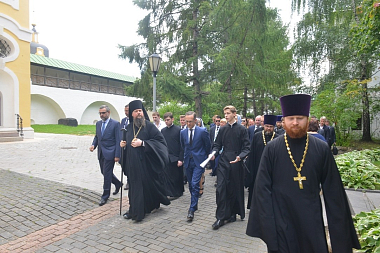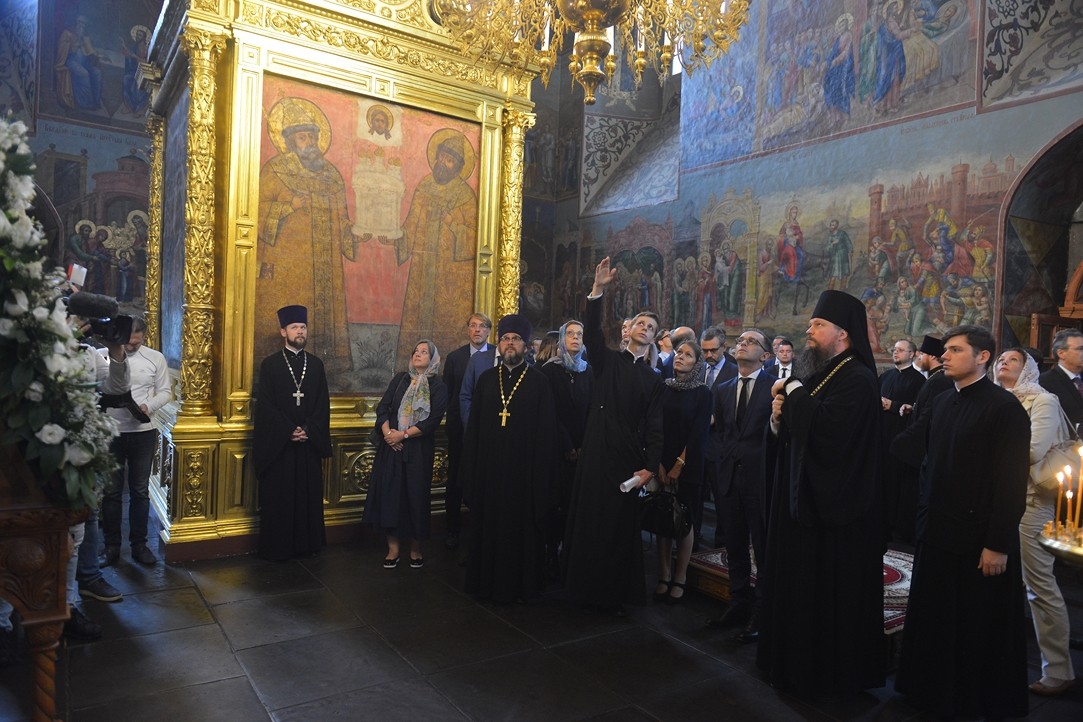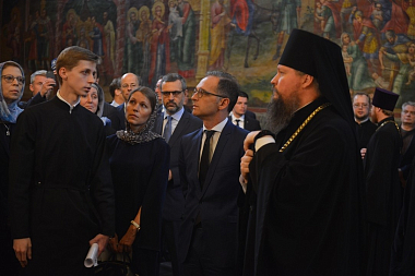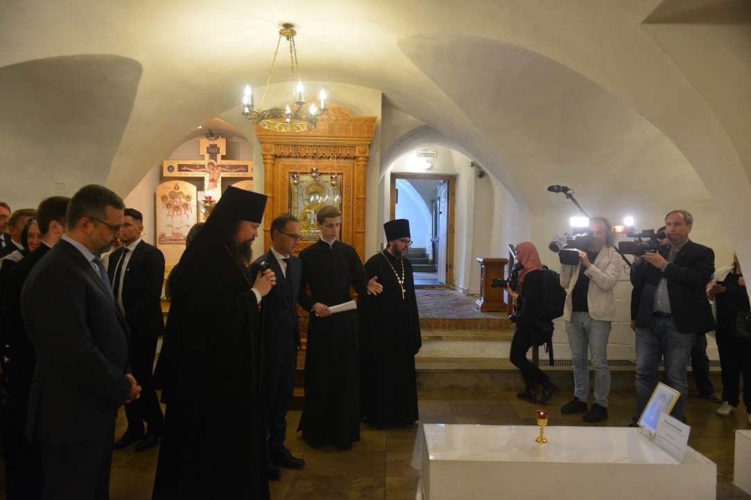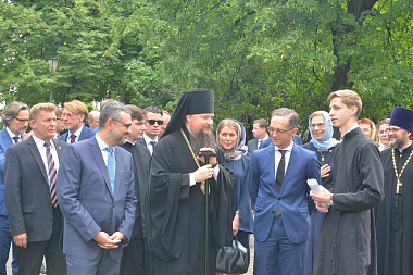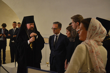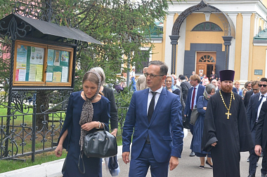 В сопровождении наместника монастыря епископа Воскресенского Дионисия глава внешнеполитического ведомства Германии ознакомился с историей и современной жизнью обители, осмотрел монастырский музей и Спасо-Преображенский собор.