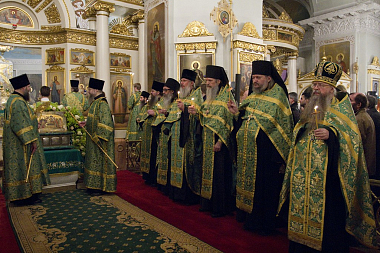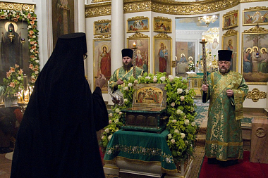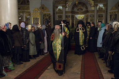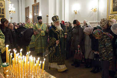 Отслужив вечерню и литию, за утреней по прочтении Евангелия и исполнения величания празднуемому святому во время чтения канонов владыка Арсений совершил помазание елеем молящихся в храме.