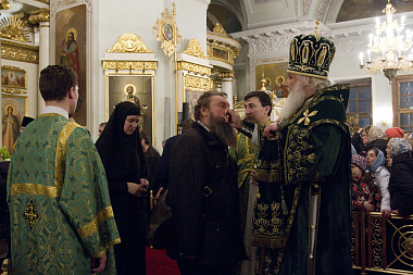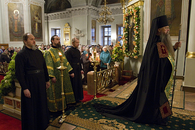 За всенощным бдением Его Высокопреосвященству сослужили наместник Даниловой обители архимандрит Алексий (Поликарпов) с братией монастыря в священном сане.