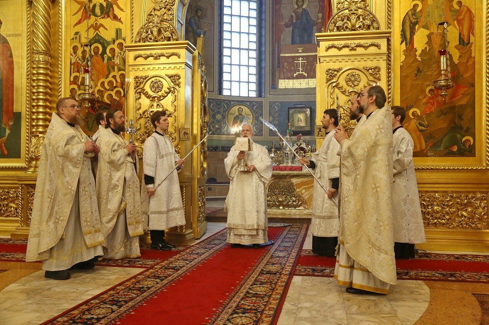 После сугубой ектении были вознесены молитвы о мире на Украине и о прекращении распространения вредоносного поветрия.