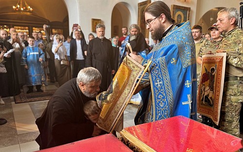 После освящения игумен Иосиф обратился со словом проповеди к прихожанам и гостям подворья, поблагодарил представителей администрации города, волонтеров и иконописцев, которые приняли участие в создании хоругвей, и отметил, что для братии и духовенства большая честь молиться вместе с воинами – защитниками нашей Родины. Архимандрит Гавриил, принимая хоругвь с ликом прп. Ильи Муромца, отметил, что образы святых покровителей земли русской духовно укрепляют воинов, являются знаком любви, молитвы и надежды на Божие покровительство и предстательство Царицы Небесной.