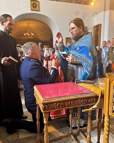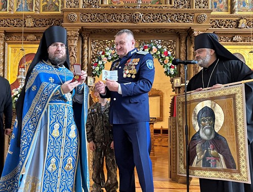 Командир диверсионно-разведывательной группы, куратор волонтерского движения «Путь победе», есаул батальона имени Цесаревича Алексия Андрей Альхимович (позывной «Феникс») вручил игумену Иосифу орденский знак Императора Николая II за вклад и помощь подразделению. Памятными медалями были награждены руководитель Иконописной мастерской А.В. Шешина, а также бойцы военных подразделений.