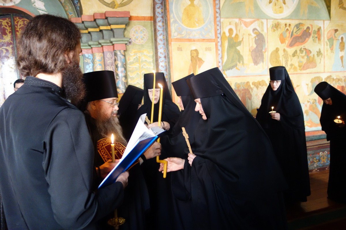 По традиции, пострижение совершалось на месте погребения основательницы обители схимонахини Марфы (+1389) в северном приделе собора Рождества Пресвятой Богородицы, посвященном Сошествию Святого Духа на апостолов.