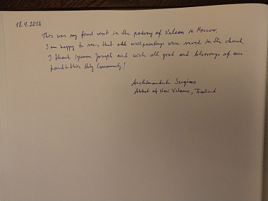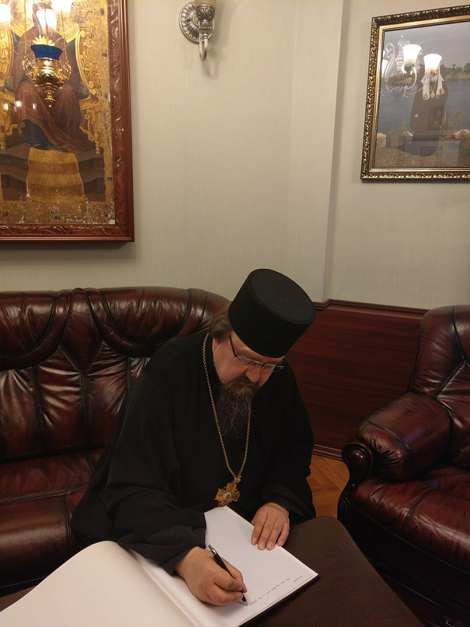 На прощание отец Сергий оставил запись в книге почетных гостей и преподнес игумену Иосифу декоративное пасхальное яйцо.