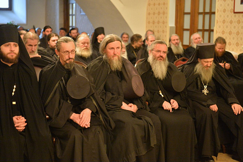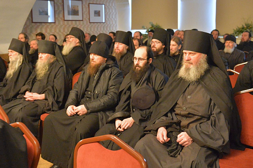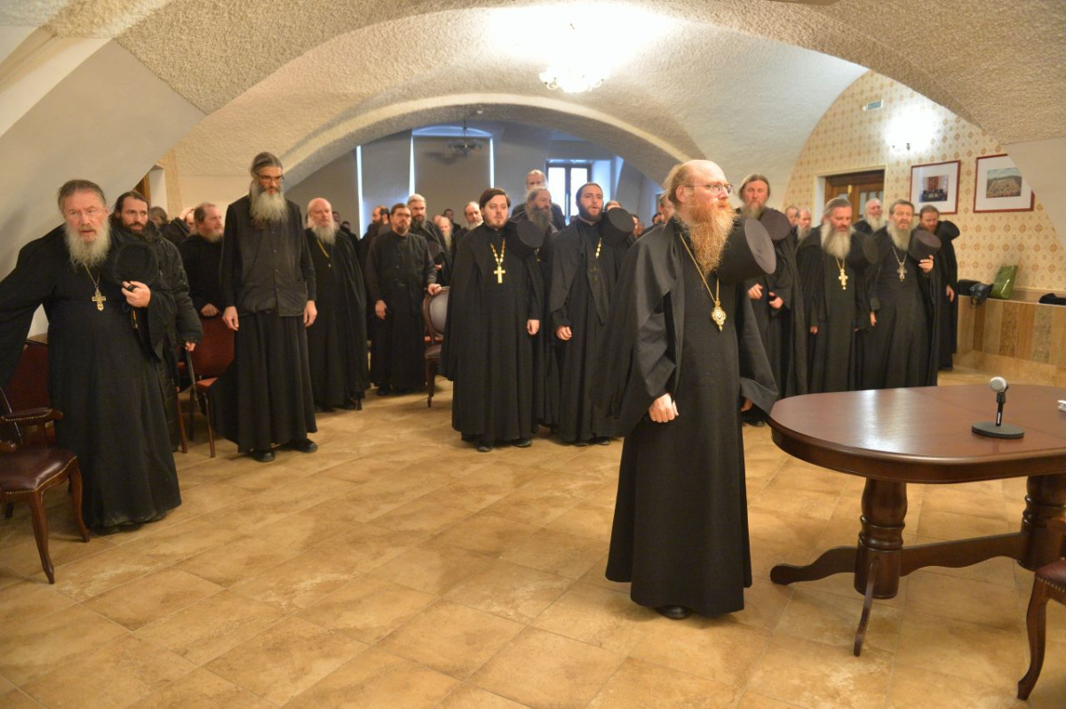 Открывая встречу, владыка Иосиф предложил братии внимательно изучить доклад Святейшего Патриарха Московского и всея Руси Кирилла, представленный на Собрании игуменов и игумений монастырей в сентябре этого года. Особый акцент был сделан на необходимости ставить дух ревности и подвига выше внешних, количественных показателей. «Горение сердца и ревность по Богу – это важная сила, которая помогает и монашествующим, и всякому верующему действительно достигать высоты духовной жизни и откроет Царствие Небесное», – процитировал наместник слова Предстоятеля Церкви.