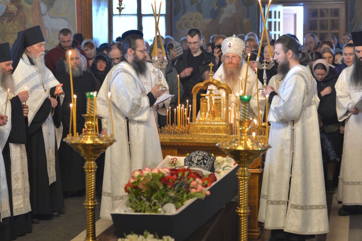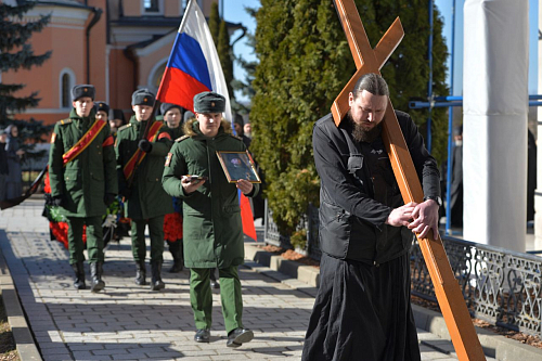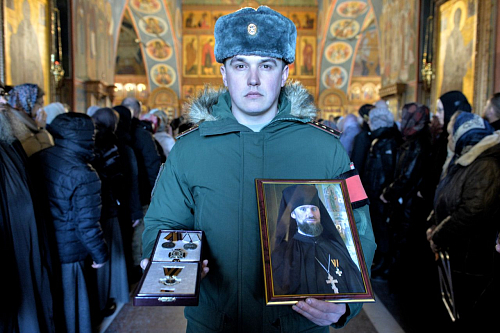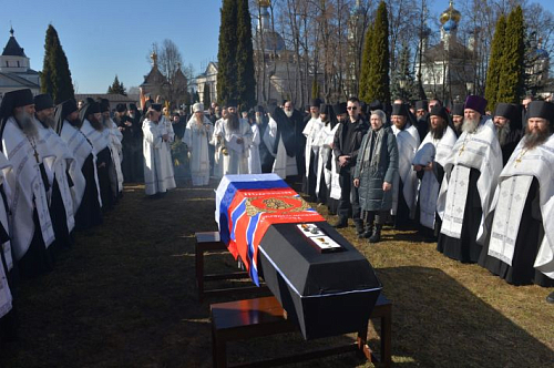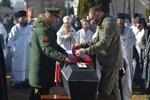 Чин отпевания, который совершил наместник монастыря епископ Иосиф в сослужении монастырского духовенства, начался по окончании Литургии Преждеосвященных Даров. В числе служащих был и отец иеромонаха Константина, священник Виктор Никитенко. Казанский храм, самый большой в обители, был полон, – помолиться о упокоении новопреставленного собралась вся братия и множество паломников. Проводить в последний путь своего боевого товарища приехали и сослуживцы отца Константина, бойцы Добровольческой бригады «Невский» во главе с комбригом Алексеем Верещагиным.