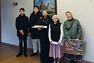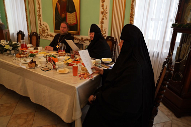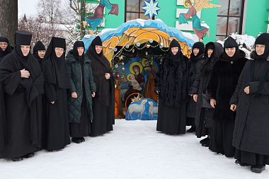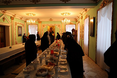 За совместной трапезой насельницы обители и сестры подворья поздравили друг друга с праздником исполнением праздничных песнопений и колядок, в пении которых участвовали все присутствующие.