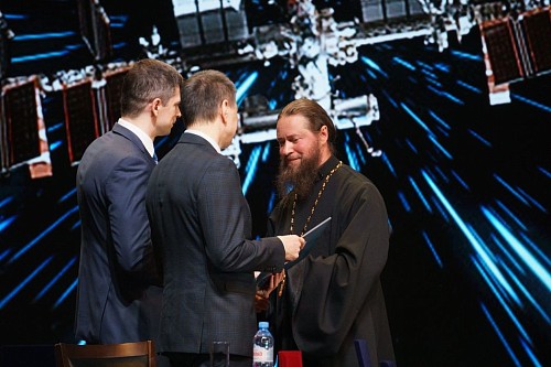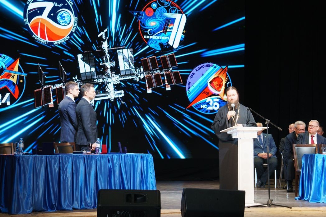 Отец Пафнутий выступил с приветственным словом и подарил космонавтам памятные подарки – книги о храме Преображения Господня в Звездном городке и храмовый календарь на 2025 год с наставлениями святых отцов Церкви о космосе и о сотворении Земли.