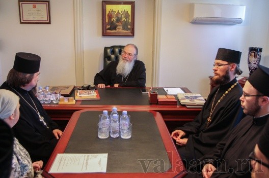 Делегацию встретил игумен Валаамской обители епископ Троицкий Панкратий в исторических покоях валаамских игуменов. До недавнего времени эти помещения старого, XVIII века постройки, келейного корпуса были заняты поселковой больницей. Лишь в 2014 г. они были полностью отреставрированы.