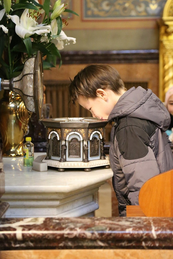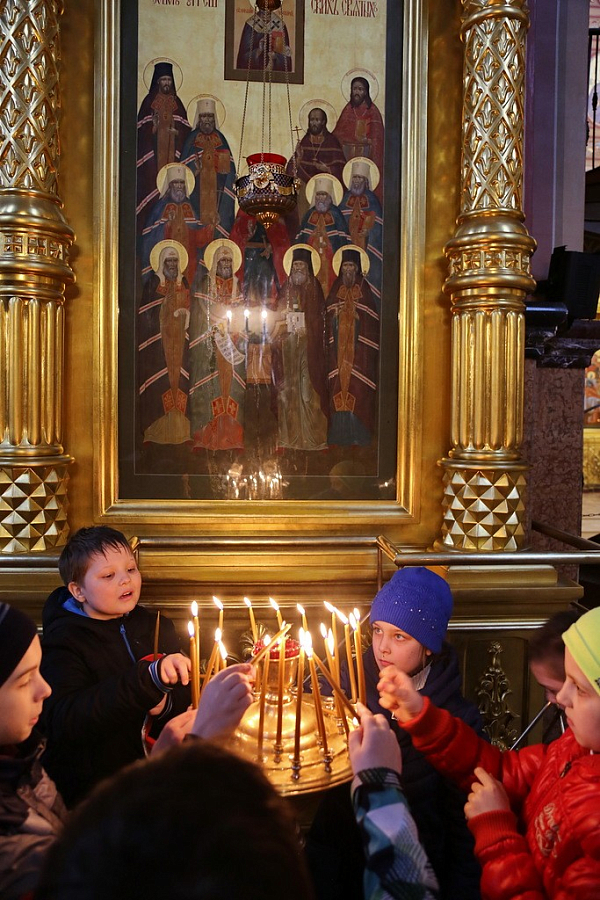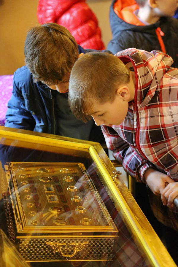 Под присмотром иеродиакона Артемия (Урбана), который является выпускником школы-интерната № 108, дети поклонились мощам святителя Николая, приложились к раке преподобного Пимена Угрешского, поставили свечи у мироточивой иконы Собора Угрешских святых. Мальчики и девочки, открывшие для себя доселе неведомый мир, внимательно слушали рассказ своего монастырского путеводителя – отца Артемия. Из Спасо-Преображенского собора отроки и отроковицы направилась в небольшую Успенскую церковь, в которой собрано много частиц мощей православных святых – наших Небесных молитвенников.