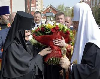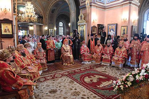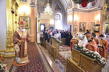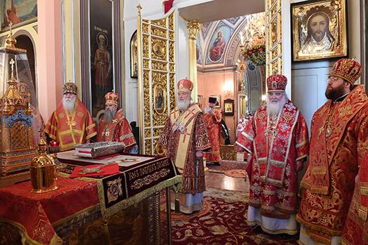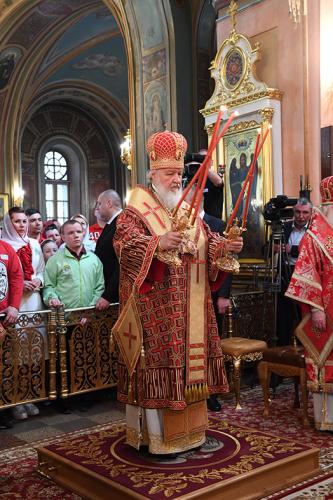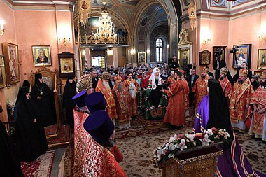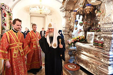 По прибытии в монастырь Святейший Патриарх Кирилл поклонился честным мощам блаженной Матроны, почивающим в храме Покрова Пресвятой Богородицы, а затем возглавил служение Божественной литургии в храме Воскресения Словущего.