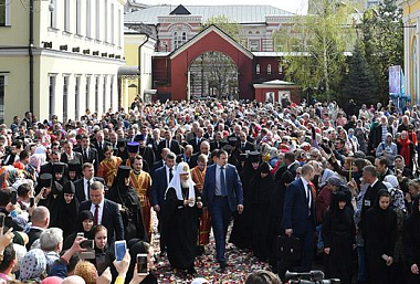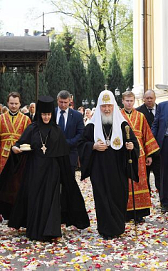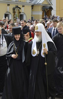 По окончании Литургии Святейший Патриарх Кирилл совершил молебен у раки с мощами блаженной старицы Матроны в Покровском храме обители и возглавил крестный ход по территории монастыря.