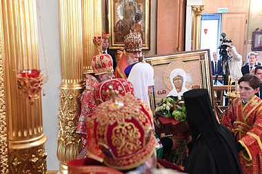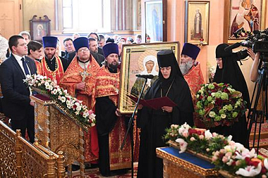 По окончании богослужения игумения Феофания (Мискина) от лица насельниц Покровского монастыря и благочестивых паломников приветствовала Святейшего Владыку и преподнесла Его Святейшеству икону святой Матроны, созданную сестрами обители в старинной технике шитья.