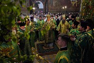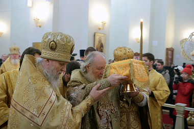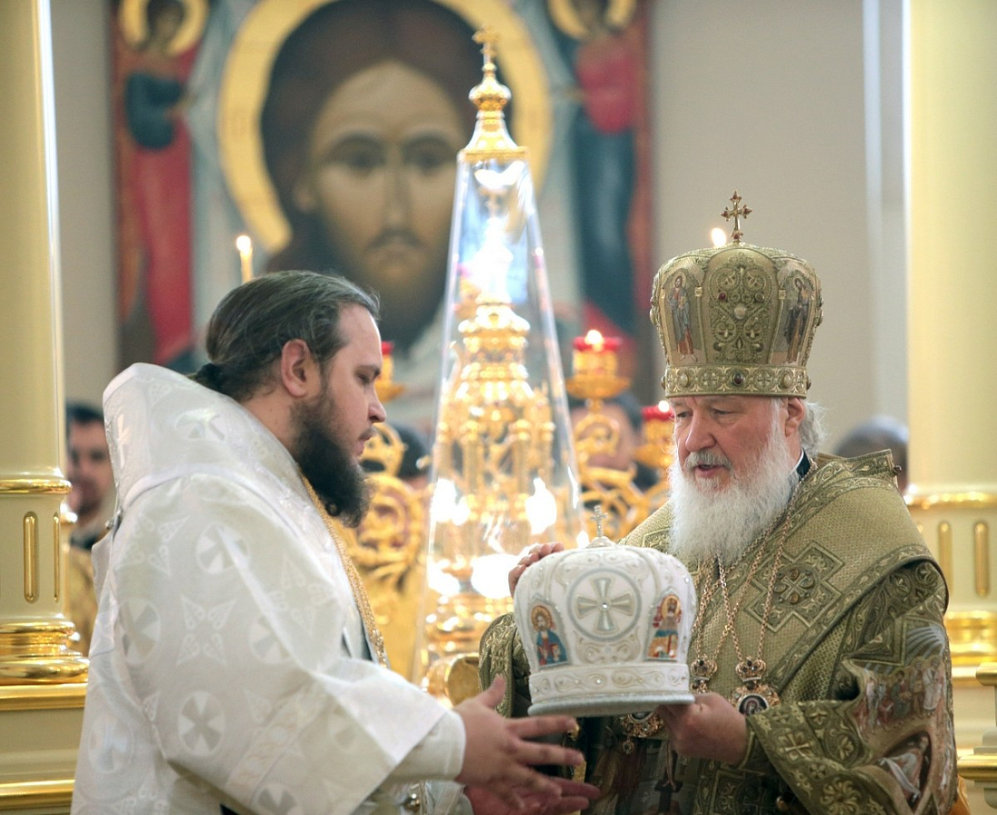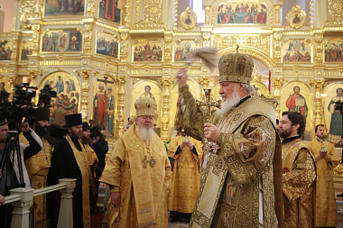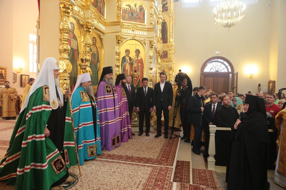 Предстоятель Русской Православной Церкви совершил чин великого освящения главного храма обители – возрожденного собора Вознесения Господня – и Божественную литургию в новоосвященном соборе.