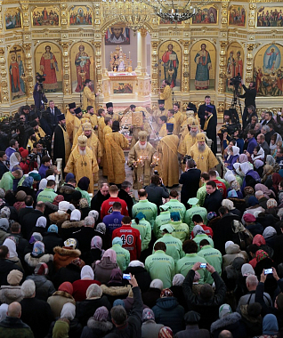 После сугубой ектении Предстоятель Русской Православной Церкви вознес молитву о всех православных христианах, во узах темничных пребывающих, а затем молитву о мире на Украине.