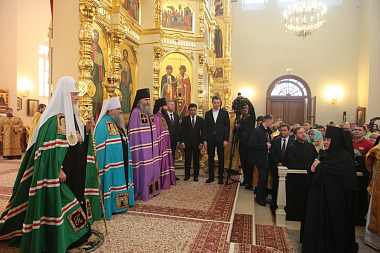 В храме присутствовали: губернатор Московской области А.Ю. Воробьев; заместитель министра культуры Российской Федерации Г.У. Пирумов; заместитель председателя правительства Воронежской области Е.А. Фадеева; председатель Законодательного собрания Санкт-Петербурга В.С. Макаров; глава Ленинского района Московской области О.В. Хромов; руководитель администрации городского округа Домодедово А.В. Двойных; благотворители Кресто-Воздвиженского монастыря.
