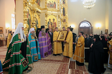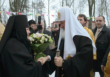 Настоятельница Кресто-Воздвиженской обители игумения Екатерина (Чайникова) приветствовала Предстоятеля Русской Церкви и преподнесла Его Святейшеству список Иерусалимской иконы Божией Матери.