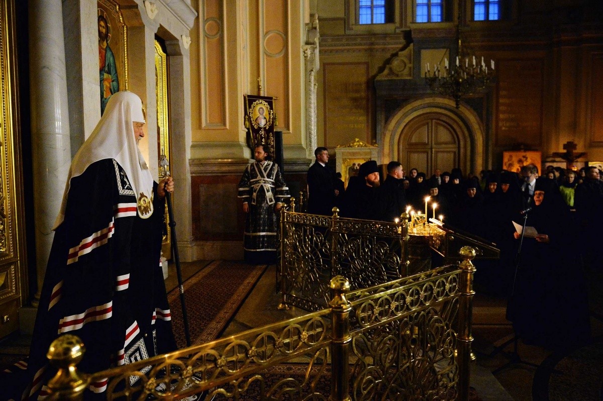 В соборном храме Предстоятель Русской Православной Церкви принял участие в вечернем богослужении в канун Великого Вторника. На великом повечерии Святейший Патриарх Кирилл читал канон Триоди, а на утрене – Евангелие.