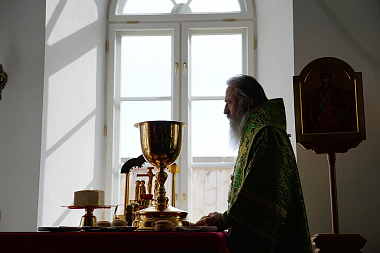 Проповедь перед Причастием произнес игумен Симеон (Хисамутдинов), настоятель подворья Соловецкого монастыря в г. Кемь, скитоначальник Андреевского скита на Большом Заяцком острове Соловецкого архипелага.