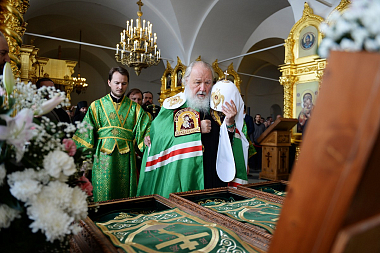 В храме Распятия Господня Святейший Патриарх Кирилл поклонился мощам преподобного Иова Анзерского, после чего побывал в храме Воскресения Христова.